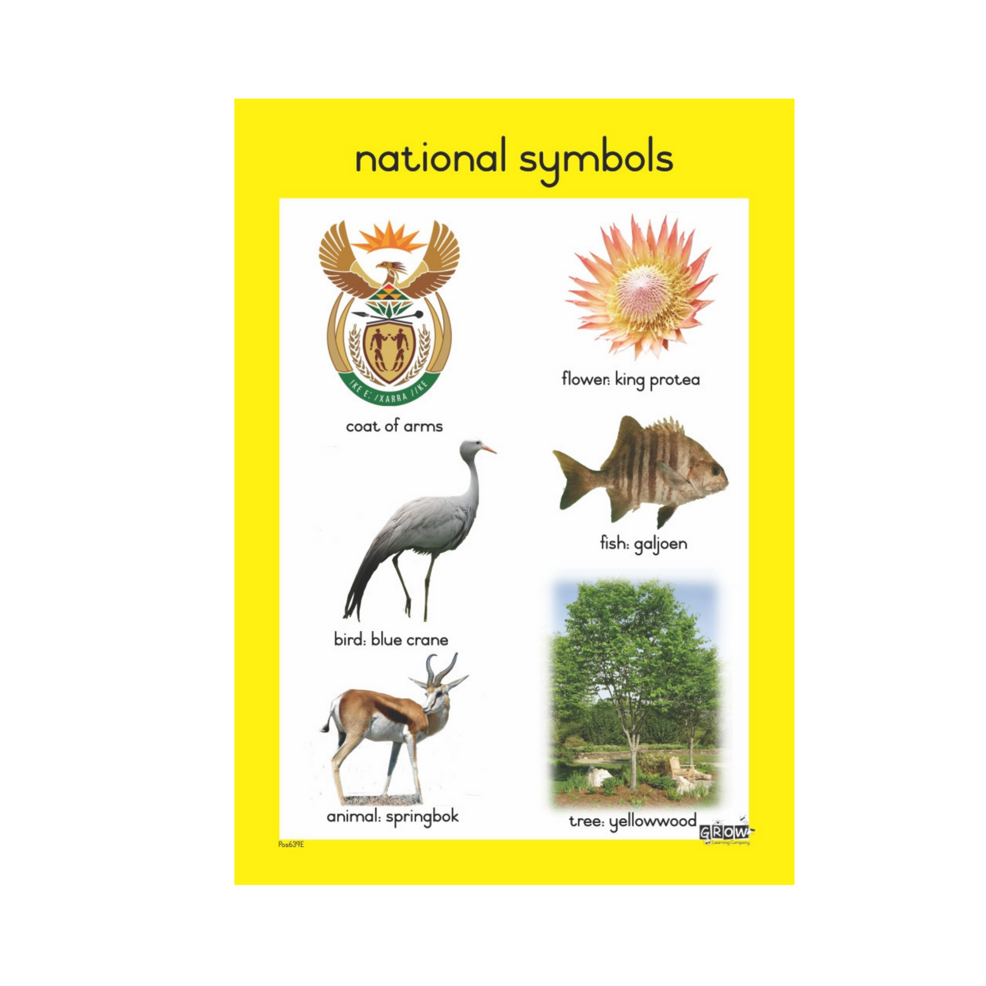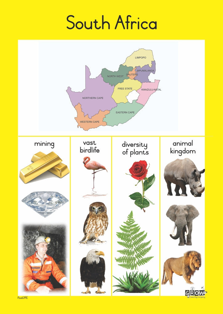 Colourful wallcharts to brighten up any environment. A must-have teacher's resource that is appropriate for the foundation phase, aiding in visual learning according to multiple learning topics. This wallchart addresses Our Country.