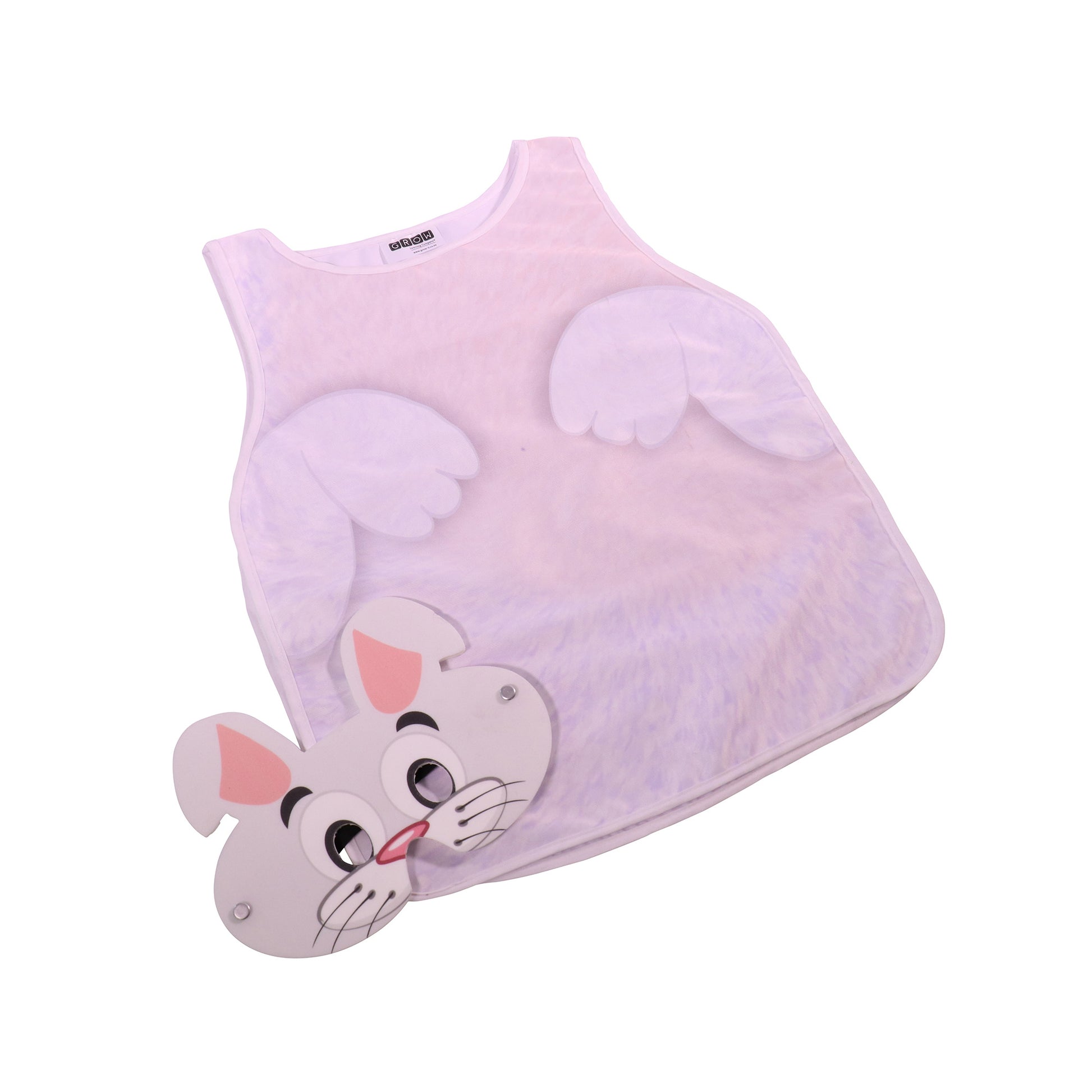 Use these bright and colourful dress-up vests for dramatic play. They are sized as “one-size fits all” and are easy to put on and take off and clean. Accompanied by a character eye mask, these outfits will allow your little ones to engage in imaginary play as their animal of choice. Here we have a dress-up rabbit.